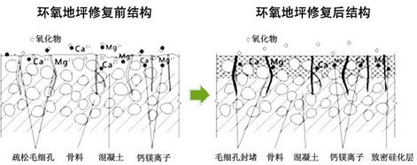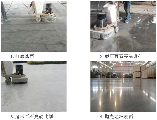 清潔地面→研磨破損環氧層→封堵毛細孔結晶→磨壓百石亮滲透劑→封堵毛細孔結晶→磨壓硬化劑→聚硅改性→拋光百石亮晶面劑→環氧地坪改造(環氧地坪修復)