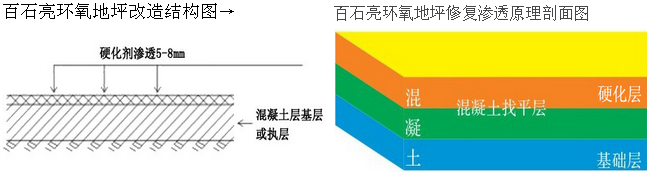 環氧地坪改造方案:用地坪研磨機研磨掉整個已經破壞的地坪表面環氧漆,然后采用百石亮地坪材料對混凝土的內部進行改性和提高強度處理,讓混凝土的整體強度、硬度、耐磨度、光潔度大大提高,同時永不再起塵砂,徹底進行環氧地坪修復,形成百石亮硬化地坪。